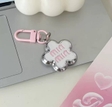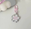 Милий рожевий брелок Min Min у формі квітки з рожевим логотипом. Аксесуар має біле або дуже світло-рожеве глянцеве покриття з рельєфним сріблястим або хромованим краєм. На лицьовій стороні рожевим кольором нанесено напис "miu miu". Виріб оснащений металевим кільцем для ключів та яскравим рожевим карабіном, що робить його універсальним як для ключів, так і як шарм для сумки.Ідеально підійде як доповнення до подарунку.розмір квітки 3 см, брелок 7 см