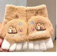 Дитячі рукавички-мітенки кольору camel з аплікацією капібарі.Рукавички-мітенки (без пальців) з відкидним верхом для перетворення на рукавиці.Матеріал: Виготовлений з м'якого, пухнастого плюшевого матеріалу, що забезпечує тепло і комфорт.Дизайн: Основний колір – світло-коричневий (camel) з білою внутрішньою підкладкою на частині для пальців.Декор: Прикрашені вишитими мультиплікаційними зображеннями капібарами та маленькими зірочками/сердечками. На відкидній частині також присутній напис "CAPY BARA".Функціональність: Відкидний клапан фіксується за допомогою ґудзика, що дозволяє легко перемикатися між режимами мітенок (для використання ґаджетів) і теплих рукавиць.Стиль: милий дизайн, ідеально підходить для повного носіння в холодну пору року.