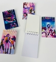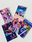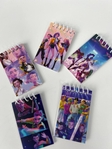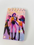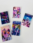 Набір з п'яти невеликих блокнотів на спіралі з яскравими обложками. Кожен блокнот має унікальний дизайн, на якому зображені анімовані персонажі в стилі K-Pop Demon Hunters. На обложці зображені персонажі Румі, Міра, Зої.Розмір блокнота 10*6
