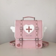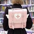 Елегантний рожевий рюкзак у формі ранця, прикрашений милими та готичними елементами. Вирізняється великим білим серцем з рожевим хрестом у центрі та написом "Sweet Girl".