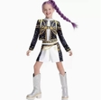 Сценічний костюм Румі з K-pop Demon Hunters Відчуйте себе частиною команди мисливиць на демонів з цим яскравим та детальним костюмом Румі! Костюм ідеально підходить для косплею, тематичних вечірок, день народження або сценічних виступів. Жакет чорного кольору, прикрашений золотистими візерунками у вигляді ланцюгів та зірок, що імітують ювелірні прикраси.Шорти білого кольору з чорними вставками по боках, які також мають принт із золотистими елементами.Розміри 110, 120, 130, 140, 150 см